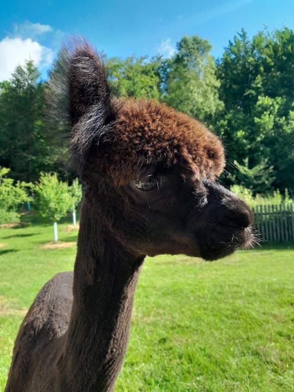 Czupel to dama o elegancji i delikatności. Jej jedwabiste futro i łagodne spojrzenie sprawiają, że jest nie tylko piękną, ale także łagodną duszą stada. Zawsze gotowa do przyjęcia głaskania, Rogacz emanuje spokojem i ciepłem, co czyni ją niezwykłą towarzyszką na spotkaniach z alpakami.